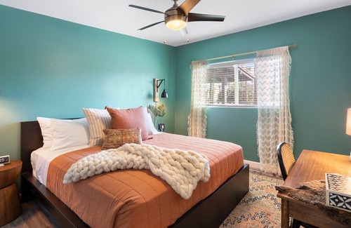 The Sunset Haus is a stylish two-bedroom apartment in the heart of Phoenix – filled with the coziness and colors of a Southwest sunset. Come relax in our living room, modern kitchen, two bedrooms and more. And live your best Phoenix life with our community amenities: From swimming and splash pools to a fire pit and arcade games. On the practical side, there is a laundry room and covered parking. Plus our central location which beckons city exploration.
