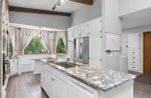 Architecturally speaking, this home is a delight to the eyes. Exposed brick and wooden ceiling beams contrast with the crisp white of the interior. Vaulted ceilings and large windows give the rooms an elevated feel. But if for some reason you want to leave this beautiful bungalow, you can rent some skates at the Anoka Area Ice Arena or dine at Riverbend Bar and Grill, both a short drive away. In warmer weather, grab the paddle boards from the outdoor garage and head to the Rum River, located a few steps from the back deck.