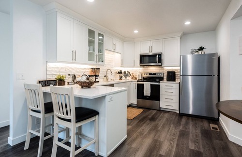 This quiet 2 bedroom(1 king, 1 queen) comes fully loaded with everything you will need to be comfortable while you stay with us. Every room has cellular wireless charging to keep you fully charged whether you’re on the go or here to simply stay in and become hypnotized by our Sisyphus sand table in the living room. The large 75” HD tv is perfect for keeping your guests entertained while food is being prepared in the adjacent kitchen. Blackout curtains in every room will ensure you sleep well and wake refreshed! Every aspect of our VRBO will allow you to feel right at home and have a wonderful next level stay!