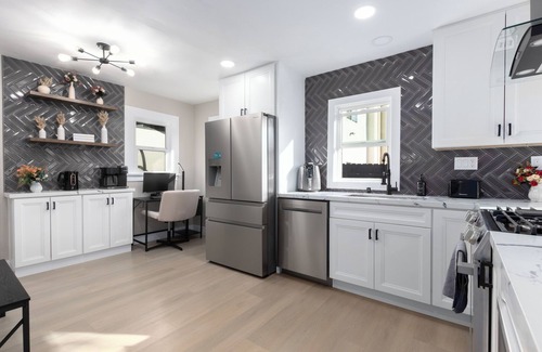 Inside, you’ll find a king bed in the primary bedroom, a full bed with a twin bunk in the second room, and a full and twin bed in the third room. A Pack 'n Play and high chair are available for families. The home features two full bathrooms—one en-suite in the primary bedroom with a shower, and another with a shower and bathtub. For working professionals, there are two desks with monitors, and a smart TV for entertainment. The fully equipped kitchen makes home-cooked meals easy, and the spacious layout ensures a comfortable stay.