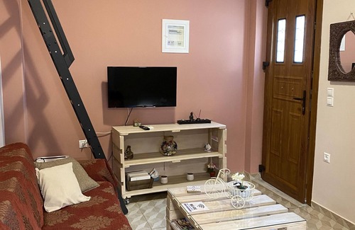Ground floor modern house 40 sq.m. with a single living room-kitchen, bathroom, bedroom with a double bed and a spacious loft with protective railings and with 2 single beds/floor mattresses. It has 2 air conditioners, a security door and double glass windows with screens.