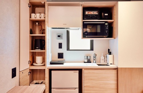 The elevator hotel has five independent suites with one suite per floor offering guests privacy Each suite is elegantly furnished with a work area suitable for small families or business travelers The hotel also offers a laundry room / This guest room is located on the 3rd floor and the only guest room on this floor The entire space is approximately 35 square meters with one bedroom and one living room The bedroom has a kingsize bed 2 single beds combined and an open Japanese style sitting area The kitchenette has a Nespresso coffee machine and all the necessary equipment and facilities for convenient living The overall space is bright and comfortable quiet and tasteful