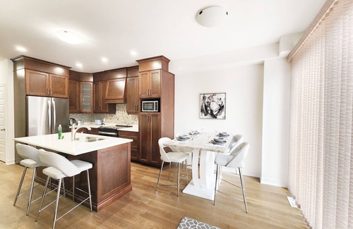 Modern, luxury new-built home in a quiet street. Ideal for travelling families or couples. Private bathrooms, super soft carpet, and firm bamboo mattresses are in each bedroom. Like a hotel, you get everything, but much more! privacy. The spacious open-concept main floor offers modern, stylish furniture, a 65-inch TV with Netflix, Disney+, and international channels, including sports and PPV. You can enjoy your private backyard with a wooden deck, BBQ, and outdoor furniture.