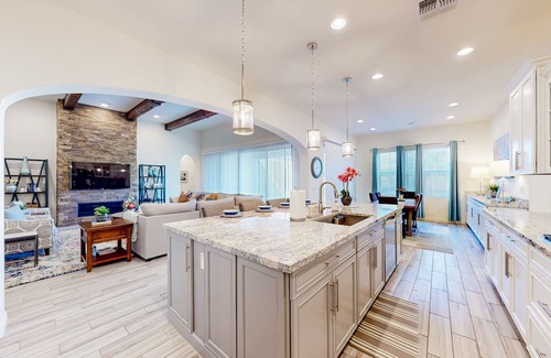 The air-conditioned interior boasts a spacious living room with exposed wood beams and modern decor throughout. Curl up on any of the inviting sofas to read a favorite book or stream an entertaining show or movie on the smart TV with streaming and cable services. Remote workers will appreciate the dedicated office space by the main entrance, which enjoys comfortable sofas and a well-equipped desk. When mealtime comes, the chef of the group will have a fantastic time preparing delicious culinary masterpieces in the spacious, open kitchen. Discover all stainless steel appliances, endless counter space, and a walk-in pantry. Additional on-site perks include a washer/dryer and board games.