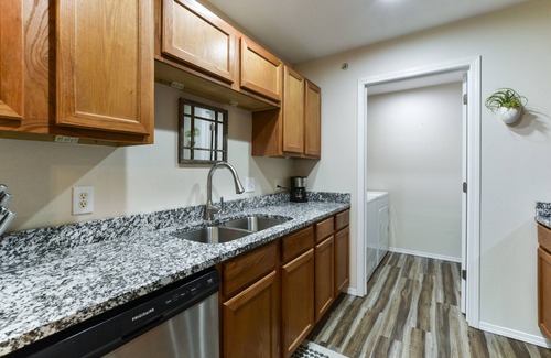 Take the perfect vacation in this newly remodeled 3 bedroom & 2 bath condo near everything! Step into our newly remodeled comfortable condo that sits perfectly between Silver Dollar City (5 miles), Moon Shine Beach (3 miles) , and only a few minutes away from Highway 76 the famous Branson Strip. We have a luxury king size bedroom with ensuite bathroom, one cozy queen bedroom, and one bunk bed room (full over full bunk bed) along with two full bathrooms (with one of them being ensuite to the King bedroom). The bathrooms come stocked with shampoo, conditioner, and body wash. The kitchen is fully equipped and perfectly suited for home cooking. Whip up your favorite recipes to serve at the elegant dining table - when you're not treating yourself to a meal out on the town! The kitchen has high quality appliances, coffee maker, coffee, water kettle, griddle, blender, mixer, toaster, crockpot, and many other items. Welcome to your home-away-from-home in Branson! Unwind after a day of travel or adventure in the cozy living room, complete with a sofa bed, and a 55" flat-screen smart TV. Sliding glass doors lead out onto the deck - the perfect spot for relaxing after a long day of fun. The condo is well stocked with all the comforts and amenities you'll need to settle right in and enjoy your stay, including high speed 1 gig Wi-Fi and access to the community pool. (The pool is open from Memorial Day Weekend until Labor Day weekend from 9 am to 10 pm and is closed after that). A large Washer and Dryer are included in the condo with laundry detergent for added convenience. There is a Portacrib and a High Chair included as well. The condo is on the lower basement level of the building and does require going down one flight of 16 stairs. We provide quality bath towels, pool towels, and extra pillows and linens for the pullout.