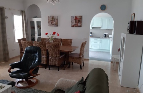 The villa is located in Fuente del Baden which is a small and quiet development of detached villas next to El Capistrano Village. The villa is perfect for self-catering holidays with a well equipped kitchen with all you would expect including electric oven and hob, dishwasher, microwave, full size fridge/freezer, air fryer and ample storage space. There is a Webber BBQ for al fresco dining on the terrace. If you fancy eating out the nearest restaurants and bars are a ten minute stroll or you can sample some of the many restaurants in the centre of town which are within a thirty minute walk or 5-10 minutes by car. There is also a local bus service running every hour from bus stops either on the main road or from Capistrano village. Burriana beach is a twenty minute walk or five minutes by car. Nearby, and within walking distance are other bars and restaurants, the paddle tennis club and two large supermarkets.