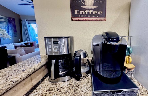 Stretch out, relax, and put on a movie on the Large Smart TV. The spacious living room, with comfortable furniture and attached outdoor balcony, is ideal for morning coffee or an evening cocktail. The dining area accommodates 4. The kitchen is stocked with everything you need to easily prepare a quick snack or a holiday feast. There's a full set of small appliances including Keurig and a drip coffee machine with a package of our favorite locally-roasted beans. The 3-Burner outdoor grill on your patio adds cooking options to your meal plan.