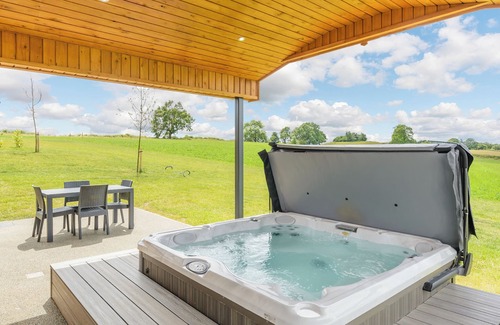 New in 2022 Luxurious and contemporary lodge with stunning countryside views. One king-size double with en suite shower, one double and one twin. Bathroom with bath and overhead shower. Open plan modern living/kitchen area with washer/dryer. Decking area with outdoor hot tub. No pets.