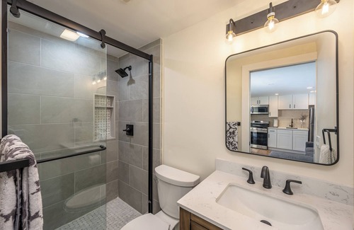The sofa bed is outfitted with soft linens, plush pillows, and thoughtful decor that promotes relaxation and a good night’s sleep. The full bathroom is fresh and modern, featuring a clean design and stocked essentials to make your stay feel just like home.