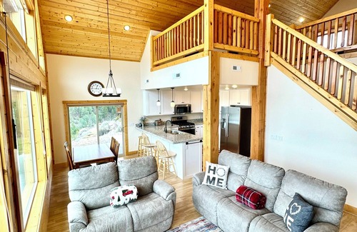 Enjoy a cozy living space with a gas fireplace and a 55” Amazon Fire TV. The cabin is equipped with all brand-new furnishings, granite countertops, a clothes washer and dryer, a dishwasher, and a gas range. Every room features windows with stunning views, custom blinds, and a large living area with two-story windows framing the picturesque lake and surrounding nature.