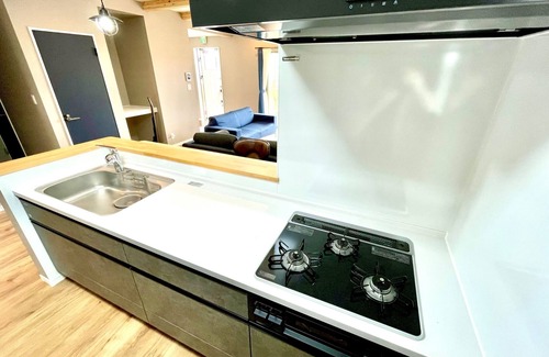 The living room is equipped with a sofa and a 55inch large TV and the kitchen is fully stocked with new home appliances and cooking utensils so that everyone can relax
