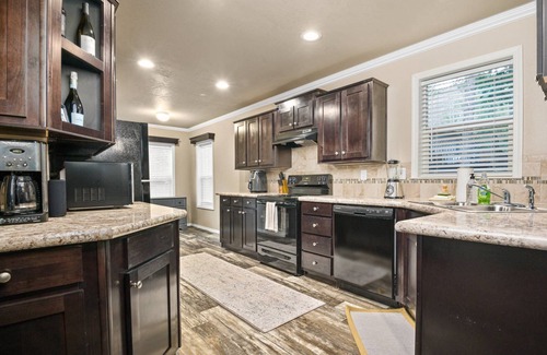 The primary bedroom features a king bed and an en-suite bathroom, providing a private sanctuary at the end of the day. A second bedroom offers a cozy queen bed, while the third bedroom is furnished with a twin-over-full bunk bed—perfect for kids or extra guests. These two bedrooms share a full bath, and there's a laundry room conveniently located off the kitchen for extended stays.