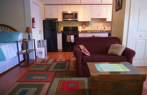 Sleeping Amenities: The queen sized bed will be made up with 1 fitted sheet, 1 flat sheet, 1 quilt, 4 pillows (2 shams and two standard cases). Additionally, a blanket is on the love seat. All of the linens (including blanket, shams, and quilts) are laundered between each guest. We can provide additional blankets upon request. Guests booking longer stays may request replacement linens during their stay - please give us 24 hours notice.