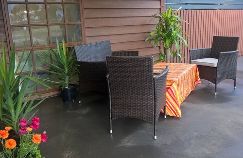 We offer family friendly accomodation in a private space for self-catering, or easy walk to cafes. There is a private covered outdoor entertainment area with furniture & barbeque. Newly renovated kitchen comes with good size fridge, cook top, micro/convection oven, usual electric appliances & front load washing machine.