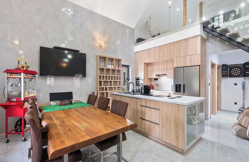 "Party & Friends Villa", 6-room house 180 m2 on 2 levels. Modern and luxurious furnishings: open living room with 1 double sofabed, open-hearth fireplace and TV. 1 room with 1 double bed (180 cm), shower/WC and TV. 1 room with 1 bed and 1 double bed (180 cm), shower/WC. Open kitchen (oven, dishwasher, 4 induction hot plates, toaster, kettle, microwave, electric coffee machine, Capsules for coffee machine (Nesperesso)) with dining table. Upper floor: 1 room with 1 double bed (180 cm), shower/WC. Playroom with 1 bed and TV. Hydro massage bath (private). Large terrace 40 m2. Terrace furniture, barbecue (portable). Facilities: washing machine, dryer. Internet (WiFi, free). E-charging station. Please note: non-smoking house. Maximum 2 pets/ dogs allowed. Open kitchen with central counter. Two sinks, integrated wireless phone charging. Built-in double tap. Massage chair, wall-mounted electronic dartboard. Fully equipped kitchen with high standards. American refrigerator with ice maker, oven, 3x dishwasher, 2x induction hob. Massive teak mango dining table for 10 people. The property offers a games room with billiards, table football, casino blackjack screen, chips, cards, electronic darts. Technical room (second refrigerator, large sink). All windows equipped with insect screens.