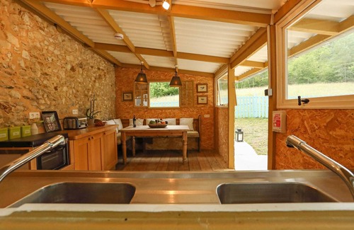 The building itself benefits from being all on one level, making it suitable for people who may have limited mobility and comprises a large dual aspect bedroom with king size bed. Unfortunately both the bedroom and bathroom do not offer sufficient width to allow wheelchair access. The large living area has a well equipped kitchen and a two sofa sitting area with flat screen TV and a wood burning stove. French doors open out onto a terrace with water source and views over paddocks (BBQ provided). The shower room with sink and toilet are fully tiled and benefits from underfloor heating.