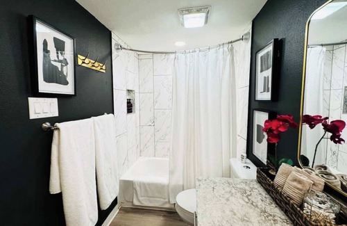 Unwind in this cozy downtown Austin retreat, where comfort meets convenience. Nestled in a quiet, safe neighborhood, you’ll be steps from restaurants, bars, a dog park, and a community pool. The 1BR/1BA features a plush king bed, a fully stocked kitchen, and a rollaway cot for a 3rd guest. Enjoy free parking, easy self check-in, and a peaceful building. Just minutes to Mozart’s Café, Lake Austin, Mount Bonnell, Congress Bridge bats, and Lady Bird Lake Trail.
