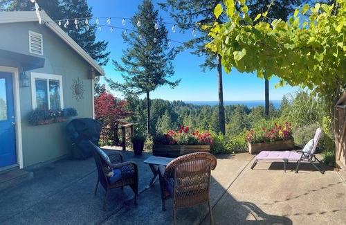 A hilltop setting among the pines, great for a romantic get-a-way or a serine, getaway for the individual. The property is extremely private with expansive ocean views from every window and a relaxing patio for sunsets. Above the fog line (usually). 3 miles to the beach and 4 to town. Many guests find themselves, just hanging out, a very relaxing and soothing property. Many birds including Pileated woodpecker and Quail. Incredible night skies! Very, very clean (my wife) and comfortable. See photos. Every year we plant new flowers, lots of new improvements, new heating system, new hot water heater, new bed and bedding and new paint. As hosts, we respect your privacy and will strive to make you as comfortable as possible.