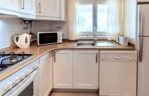 Kitchen equipped with a fridge-freezer, oven, stove, microwave, dishwasher, coffee maker, kettle, toaster, juicer, blender and tableware.