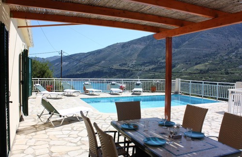The lounge opens onto a large patio with magnificent views over the bay to Assos and Lefkas beyond. The barbecue is on this terrace which also has a dining table and 6 chairs for those outdoor feasts! The villa has its own private swimming pool with sun patio and 6 sunbeds.