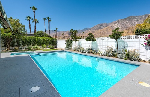 Located in the historic Indian Canyons Golf Resort neighborhood, this 1,884 sq ft vacation home features resort amenities including a large pool, bubbling spa, Gazebo with lounge area, covered patios with six colorful lounge chairs, gas grill, water features, West-Facing backyard and much more. In addition, two King beds, patios off of guest bedrooms, modern furniture and a sunny interior create the ideal Palm Springs experience.