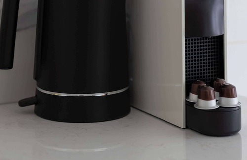 The bright kitchenette is equipped with an oven, a fridge with a freezer, a dishwasher, and a capsule coffee maker, allowing guests to easily prepare their favorite meals and beverages.