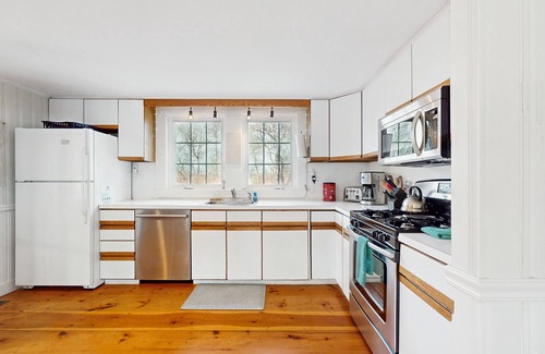 This immaculate, sun-lit home features a spacious living room with a comfortable sectional sofa, a gas fireplace, and a large flatscreen TV. Prepare anything from your morning coffee to full dinners in the open, well-equipped kitchen, and then dine inside or outside on the multi-level deck. This home also offers a cozy sunroom and a landscaped yard fenced in on two sides and open to the woods at the back - perfect for outdoor games with your kids and dogs. You're sure to enjoy the comforts and amenities of this Chatham vacation home.
