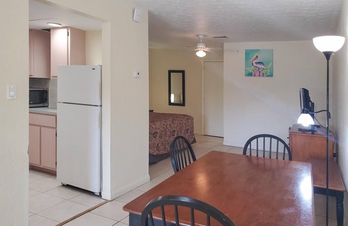 The Captains Table Hotel is a quaint lakeside hotel located just one block from Lake Placid. Whether you are looking to spend your days relaxing poolside, boating or fishing on the water, or going on an Everglades Adventure, you are sure to enjoy your stay! Our Queen Suite with Kitchen features 1 queen bed and a full kitchen. Amenities include a full kitchen with a refrigerator, stove, microwave, and coffee maker, a dining table, a TV, and Wi-Fi. This room has a split bathroom layout, one bathroom with a sink and toilet and one bathroom with a sink and shower. Hotel amenities include free parking, outdoor pool, pool towels, and a covered picnic area.