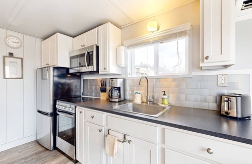 Back at Junebug Cottage, continue to enjoy serene ocean views from the large front windows. Modernly updated and cooled by central air, you'll fall into effortless comfort from the moment you walk through the front door. While visiting with your loved ones, sit back and stream your favorite shows on the large smart TV, or cook amidst the well-stocked kitchen's stainless steel appliances. The quaint bedrooms are both lined with inviting colors and soft linens. Additional interior amenities include a fireplace and board game collection.
