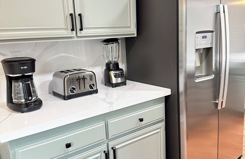 The living room, dining, and kitchen is an open living feel. The modern kitchen is recently updated with newer appliance, paint, handles, knobs, and hinges. Again, a ton of storage for additional items; but the kitchen is full stocked with needed pots/pans, utensils, cups, everyday appliances (coffee pot, toaster, blender, and more), and small amount of grocery items plus seasonings. Off the kitchen is a cozy dinette area. Perfect for morning coffees/teas. Also, in unit washer/dryer is off the kitchen, along with access to the garage. In the main living room, there is a large ceiling fan to stay cool, comfortable leather couch with modern black leather chairs. There is a light rugs for comfort, and to break up the tile.
