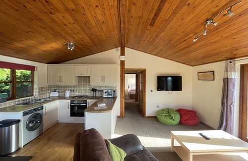 The lodge includes a double bedroom with TV and en-suite shower room. The twin room has two single beds; both rooms have plenty of storage. There is a further bunk bed room, with beautiful views, and a family bathroom, with bath, shower and heated towel rail. The lodge has a well equipped open kitchen, dinning and living area, with plenty of space. French doors open on to your own private decking area, with outside table and chairs, so you can have a glass of wine and take in the view. The lodge has a grassed garden area to the front and private parking for two cars.