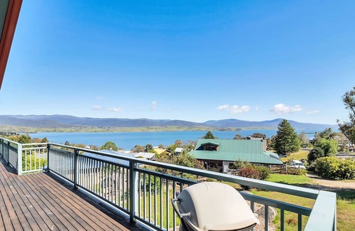 Spectacular views over Lake Jindabyne and the Snowy Mountains are on offer from the balcony on the top level of the property.