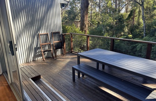 The living room features an entire wall of glass doors that open onto the rear deck, offering peaceful views of the surrounding trees and vibrant birdlife that make this place their home. It’s an ideal spot for morning yoga or watching paddy melons graze in the afternoon sun. Enjoy outdoor dining with the alfresco table and unwind on the deck chairs, or head down the stairs to the fire pit area for evening gatherings.