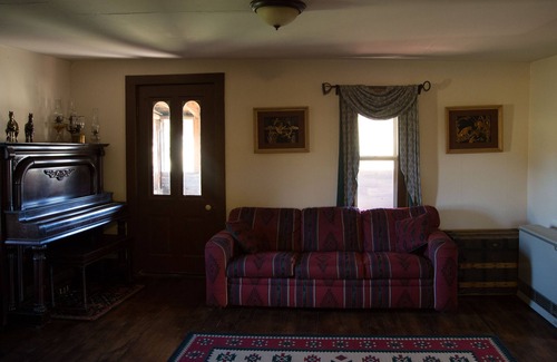 The house has 2 bedrooms with double beds and a fold out sofa bed. It has a fully functioning kitchen and a smaller bathroom. There is also a covered porch to take in the mountain views and a fire pit to enjoy the stars of the Big Sky during the evening. Often during the summer, a herd of elk grazes in the hay field right out the back door.