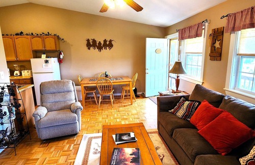 The Cowboy Cabin is one of two non-connected duplex cabins. It features one bedroom with a queen bed, one bathroom with a shower & jacuzzi tub, fully-equipped kitchen, comfortable dining and living space, flat screen cable TV and wifi. Linens and kitchenware are provided. They both have a covered, wrap-around porch with rocking chairs and stunning views of the property, as well as an outdoor common area with fire pit and gas grill. Propane and firewood also provided. Each cabin is ramp-accessible for easy entry.