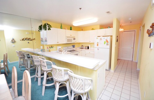 The spacious living room is furnished with a sectional sofa, a comfortable chair, a fireplace and a television. The sofa doubles as a queen-size sleep sofa. The sliding balcony doors allow plenty of natural light to brighten the space. Right off of the living room is a dining area, perfect for enjoying meals with the family. Next to the dining area is the kitchen with a breakfast bar, just right for grabbing a quick bite. The master bedroom has a king-size bed, a private bathroom and balcony access. The second bedroom has two twin beds and a television. The second full bathroom is located in the hallway. This property comfortably sleeps up to six people, so bring the whole family!
