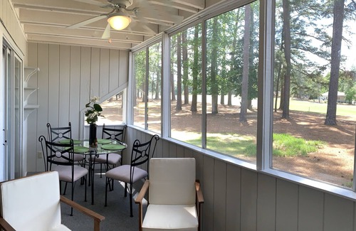 A short walk to the Pinehurst Clubhouse where you find Golf; Tennis; Swimming; Dining. This is a great place to relax and unwind! This Ground Floor Condominium is backed to the fairway of Course #5. Easy access to Downtown Pinehurst, Pinehurst Country Club and Historic Pinehurst Harness Track. Unit features full screened all weather Patio with golf course views; 2 Bedrooms, both featuring two double beds, 2 full baths; Fully equipped Kitchen; Wide screen TV with Full Cable and Internet/WIFI!