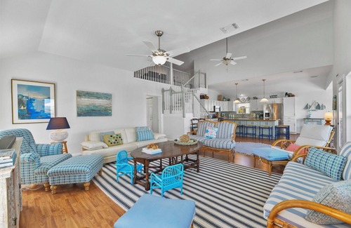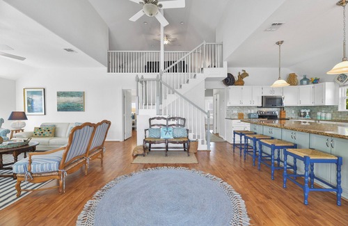 Bella comfortably sleeps between 10 to 11. There are 3 full bedrooms (a Queen, a King and a Queen with an attached top bunk), and an airy loft in the living area that doubles as a playroom and sleeping area (it includes a futon, a daybed and a pullout loveseat). All three bedrooms complete with a smart TV, cable and internet for catching up on the news or relaxing with a movie or TV show after a day in the sun or fishing. The house has 2 1/2 bathrooms, plus an outdoor shower with cold and hot water for rinsing off after kayaking or a swim. Bella has a big open kitchen with dining table and island- perfect for post-beach family meals. The kitchen is fully equipped for cooking and baking and has a range/oven, dishwasher, microwave, and refrigerator/freezer. There’s a spacious living room (complete with 60 inch smart TV with cable and internet) for lounging or playing games. A washer and a dryer are conveniently located in the hallway between the kitchen and two of the bedrooms. The house has full Wifi coverage for connecting your devices to catch up on social media, emails, news and similar in between enjoying the outdoors.