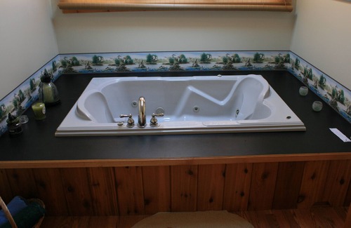 The house has a large combined living room and fully-equipped kitchen with cathedral ceilings. Both bedrooms look out on the woods - one with a queen bed and one with a double bed. The bedroom with the double bed has a screened in porch. The spacious bathroom has a stand-up shower and a 2-person jacuzzi tub.
