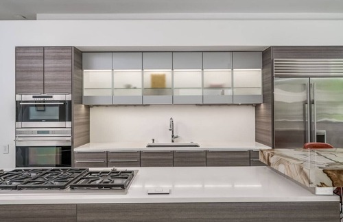 The public spaces are bright modern design with contemporary art & luxury furnishings. The home is full of contemporary art and sculptures for you to experience. The chefs kitchen has Wolf/Subzero appliances and natural marble counter. The kitchen is fully stocked for cooking and dinner parties.
