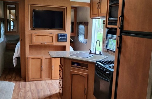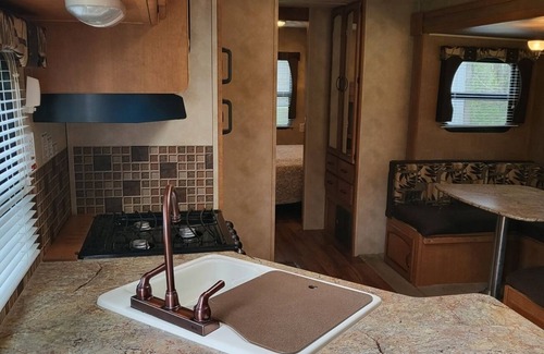 This Cozy Camper is located right beside the river. Relax and unwind on the covered porch. Two comfy queen beds and private bath. Full kitchen & eating area . River bar area for gathering and grilling. Restaurants & shopping minutes away.