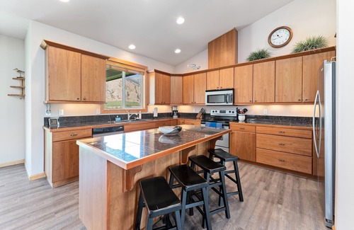Sit outside on your covered patio and soak up the Columbia River views at this waterfront home in Central Washington! A sprawling lawn extends from the patio right up to the dock (shared with the neighboring home) and sandy beach on the river. Watch for bald eagles, osprey, and heron, as wildlife frequents this quiet spot on the river. Inside, you'll be treated to a garden tub in the master bath, an open floor plan with a fully-equipped kitchen and spacious family room, as well as a den that's perfect for movie nights for the kids.