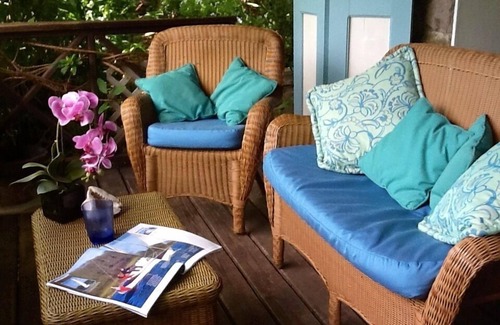 Birds & Bees Cottage, as the name implies is a romantic stone cottage with shingle roof trimmed with white gingerbread. It has a king sized 4 poster bed draped in netting, antique furniture, a huge 30' x 8' verandah with a hammock for those afternoon naps. Lovely views across the tropical garden filled with an assortment of flowers and trees with many birds flitting through. There is a palm fringed pool shared with Sapodilla cottage also in the 2 acre garden. Both cottages are very private and peaceful and well separated from each other. I ask a minimum of 5 nights.