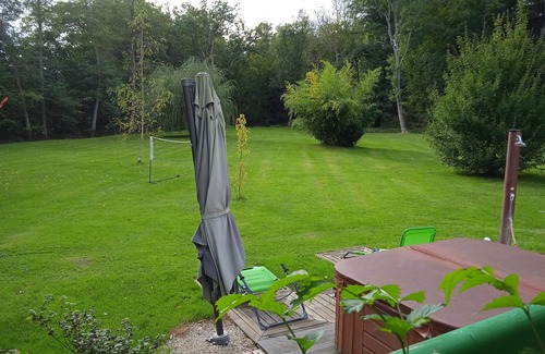 Large unfenced space with garden furniture, jaccuzi, deckchairs, babington, barbecue, river and large pond of 9 hectares for fishing.