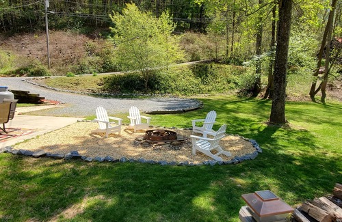 This rustic two-story newly renovated cabin is right on a creek with a covered bridge and water wheel. There is a new mini split system for heating and air conditioning with remote control thermostats. You can sit on the covered porch and listen to the creek or wade in the creek and be splashed by the water wheel. Located just 15 minutes from the Harrah's Valley River Casino or beautiful downtown Murphy and just a short drive to John C. Campbell Folk School. There is a propane grill outside with table and chairs for outside dining and also Adirondack chairs to sit and enjoy the creek. There is a fire pit with wood so you can enjoy a nice fire and roast marshmallows. From the downstairs living area, you can look out the windows and enjoy the view of the creek and water wheel. There is a foosball table, DVD player and movies for rainy days, board games and a smart TV with WIFI. The kitchen has a full-sized refrigerator, stove, microwave, and sink. There are plates, silverware, glasses, coffee pot and coffee cups so you can prepare meals if you wish.