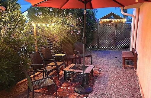 Quaint Private Studio tucked away at Mystic Ranch just steps from parking. Gated entrance to private grassed garden with barbeque, patio table & sunbrellas. Comfortable new queen bed, dressor, hanging and cubical storage. Cozy fireplace, with swivel wall TV featuring Roku, Hulu, Netflex and Youtube TV paid channels. Comfortable sofa - chaise with ottoman and side table. Kitchenette incudes microwave, Oster oven with airfryer, refrigerator, ice machine, coffee pot, and some countertop cooking. Nice walk-in shower, bathroom storage and medicine cabinet. This is a very fun "tiny house" layout with very flavorful Southwest style decorations. Property also has a swimming pool, Jacuzzi, and Day Spa with Massage & Facials by appointment.
