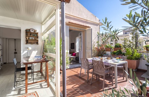 Large and bright apartment in the center of a historic Art Nouveau building. It is recommended for those who love relaxation and comfort for short and medium-long periods. The splendid terrace with a hanging garden offers the opportunity to eat outdoors and enjoy a panoramic view over the rooftops of the historic center.