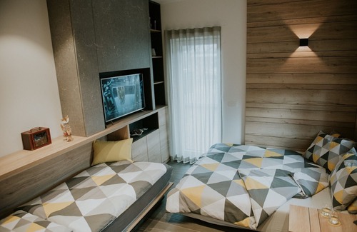 The apartments are ideally situated between the center of Kranjska Gora and the ski resort, just 100 meters from the nearest ski lift. They feature a joint living room and kitchen, bedroom, bathroom, and an atrium with mountain views. The living rooms have a large couch that unfolds into a double bed or twin single beds, and an Android TV with Netflix. Both apartments have access to a terrace. The bedroom offers a queen-size. There is free garage parking with ski storage and ski boot dryers.
