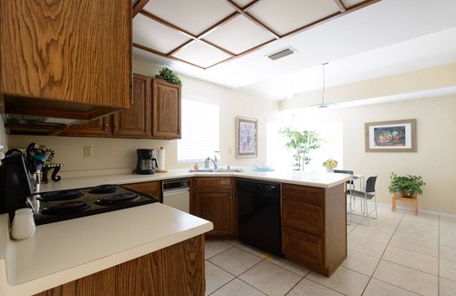 The kitchen is spacious with full-size appliances. There is a reverse-osmosis (RO) purified water system that supplies the ice maker and a separate faucet for drinking water. Plenty of pots, pans, dishes, small appliances such as a toaster, blender and mixer. There's glassware and stemware, and plastic ware for the pool. It has a separate eat-in kitchen area with table and four chairs, and a breakfast bar that comfortably seats two. A separate formal dining area will seat six. A closet in the kitchen hides a full-size washer and dryer. Everything you need.