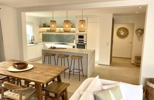 The living room on the ground floor opens to the chic covered outdoor seating area by the own illuminated pool (approx. 7 * 4m). On the terrace there is also a modern, luxurious dining area for 8 people. The gas grill with paella pan invites you to cook together.